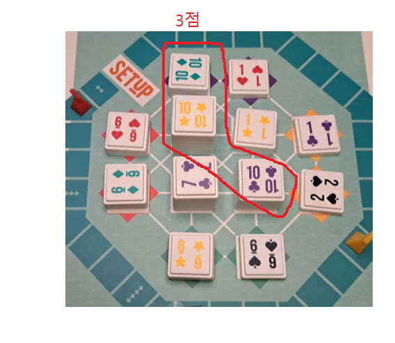 이번 플레이어가 중앙의 별 10과 클로버 10을 배치했다고 하면 해당 플레이어는 3점을 획득한다.