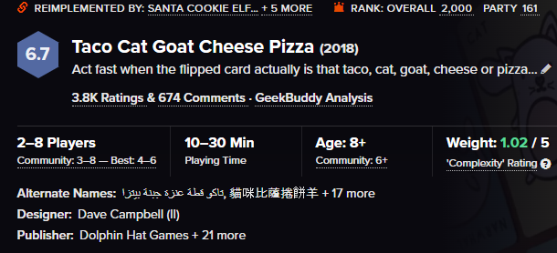 즉, 플레이어들은 타코 → 캣 → 고트 → 치즈 → 피자 → 타코 순으로 카드를 뒤집으며 외쳐야만 한다.